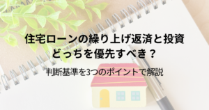 - 住宅ローンの繰り上げ返済と投資、どっちを優先すべき?判断基準を3つのポイントで解説「まとまったお金ができたんですが、 住宅ローンを繰り上げ返済したほ… 続きを読む: 住宅ローンの繰り上げ返済と投資、どっちを優先すべき?判断基準を3つのポイントで解説
